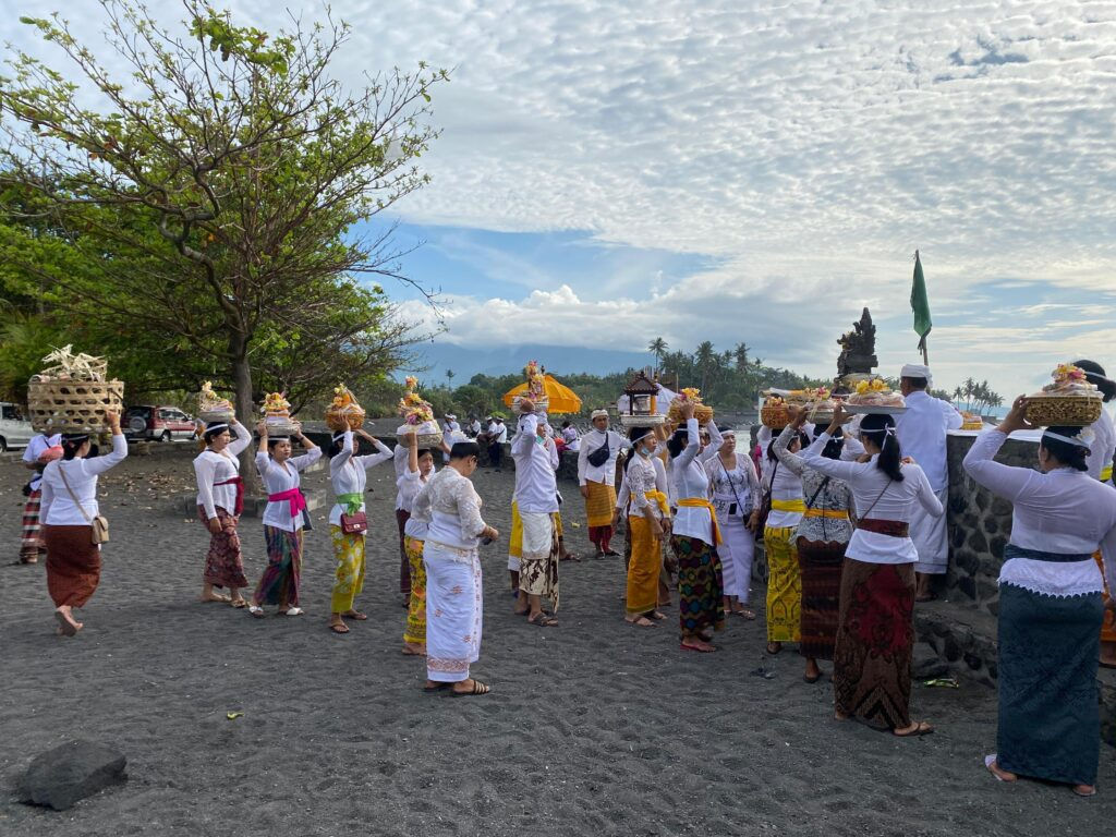 At sunrise, the village begins to stir. People dress in ceremonial white and yellow. The air smells of incense and sandalwood. Gamelan music echoes across the rice fields.
